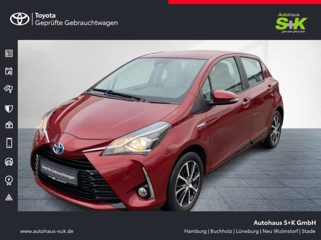 Perleffekt-Lackierung Plus-Paket Einschaltautomatik für Fahrlicht Innenspiegel mit Abblendautomatik Sitz vorn rechts höhenverstellbar Zentralverriegelung / Startanlage Smart-Key. Entry & Drive 3. Bremsleuchte Airbag Fahrer-/Beifahrerseite Aktive Kopfstützen vorn Anti-Blockier-System (ABS) Audiosystem: Multimedia Toyota Touch mit Rückfahrkamera 6 Lautsprecher Audiobedienung am Lenkrad Farbmonitor Freisprechanlage Bluetooth Rückfahrkamera Universal-Schnittstelle (USB-/ iPod-/ AUX-Anschluss) Außenspiegel elektr. verstell- und heizbar Außenspiegel lackiert Elektromotor 45 kW (Hybridantrieb) Elektron. Stabilitäts-Programm mit Antriebs-Schlupfregelung (VSC mit TRC) Fahrassistenz-System: Berganfahrkontrolle (HAC) Fensterheber elektrisch vorn Getriebe Automatik stufenlos – CVT Handbremshebelgriff Leder Heckscheibenwischer Isofix-Aufnahmen für Kindersitz Karosserie: 5-türig Klimaautomatik Knieairbag Fahrerseite Kopf-Airbag-System Kühlergrill schwarz Lenkrad (Leder) Lenksäule (Lenkrad) verstellbar LM-Felgen Modellpflege Motor 1.5 Ltr. – 55 kW 16V Hybrid Hybrid 74 kW (Motor 1.5 Ltr. – 55 kW 16V) Multi-Funktions-Display (TFT) Nebelscheinwerfer Projektor-Scheinwerfer Reifen-Reparaturkit Rücksitz geteilt Rücksitz klappbar Schadstoffarm nach Abgasnorm Euro 6 Schalt-/Wählhebelgriff Leder Schleudertrauma-Schutzsystem Seitenairbag Sonnenblenden mit Make-up-Spiegel Sonnenblende rechts mit Make-up-Spiegel Tagfahrlicht Toyota Safety Sense Fahrassistenz-System: Auffahrwarnsystem (Forward Collision Warning. FCW) Fahrassistenz-System: Autonome Notbremsfunktion (AEB) Fahrassistenz-System: Fernlichtassistent (Abblendautomatik Fahrlicht. AHB) Fahrassistenz-System: Pre-Collision-System (PCS) Fahrassistenz-System: Spurhalteassistent (LDA) Fahrassistenz-System: Verkehrszeichenerkennung (RSA) Scheibenwischer mit Regensensor Türgriffe außen Wagenfarbe Türverkleidungen vorn mit Softtouch-Elementen Wegfahrsperre Zentralverriegelung mit Fernbedienung Den genauen Ausstattungsumfang erhalten Sie von unserem Verkaufspersonal, bitte kontaktieren Sie uns. Zwischenverkauf und Irrtuemer vorbehalten.